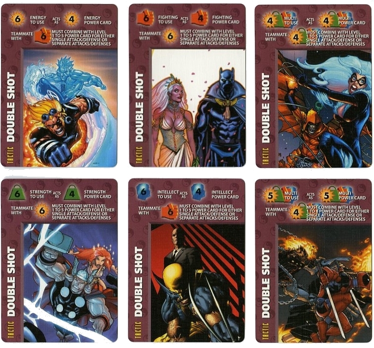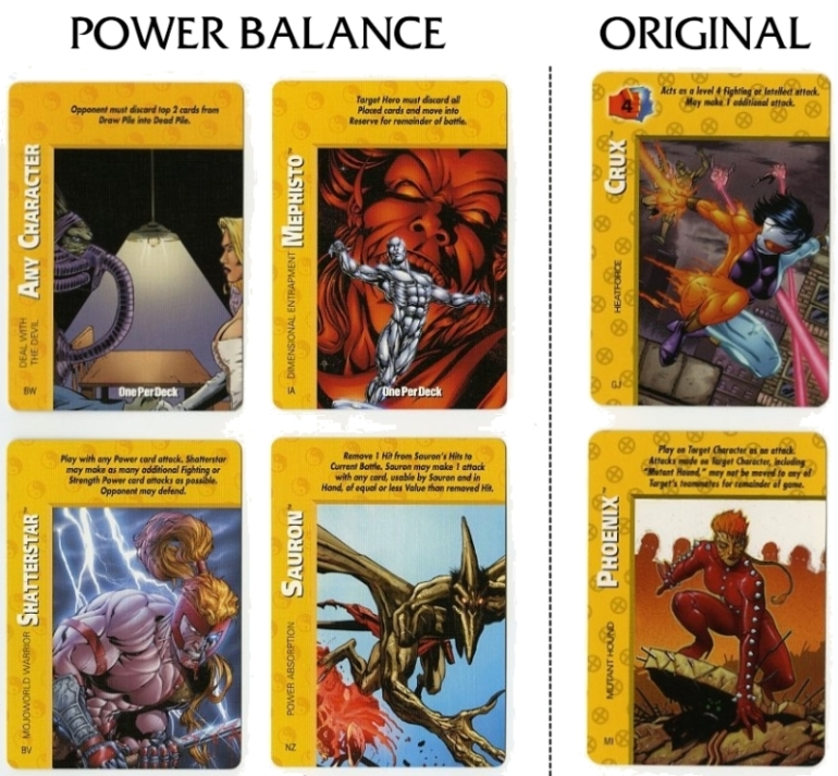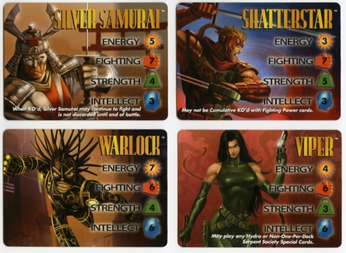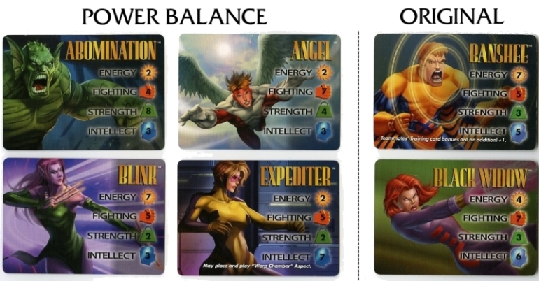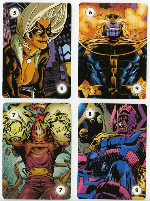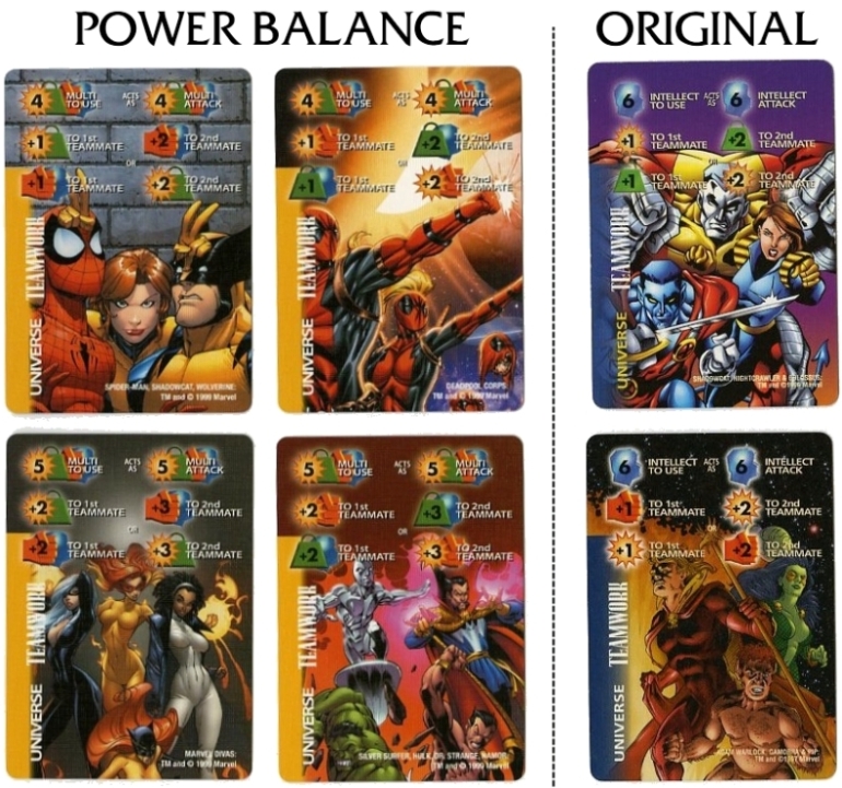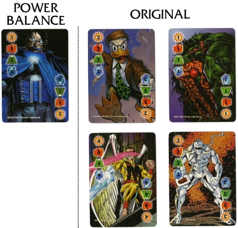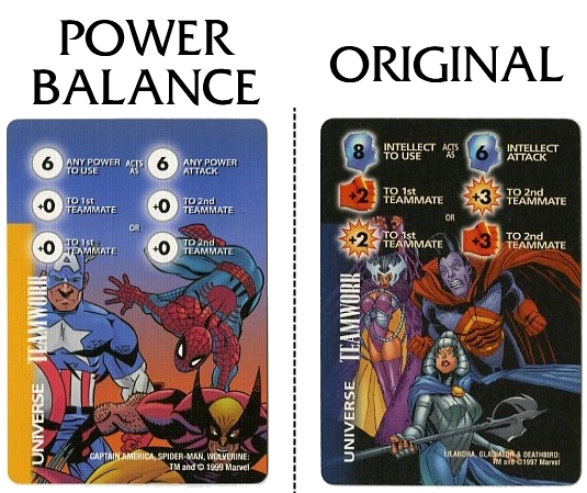 The back of the instruction manual has a table of all the updated Point Values for each character. Unfortunately, only all the 4-stat Marvel characters could fit on this sheet. Point Values for all DC, Image and 3-stat Marvel characters can be downloaded from The Rules section at the very top under "Quick Downloads". The font is the same as the instructional text on Special cards, and the little Overpower diamond makes an appearance here as well.